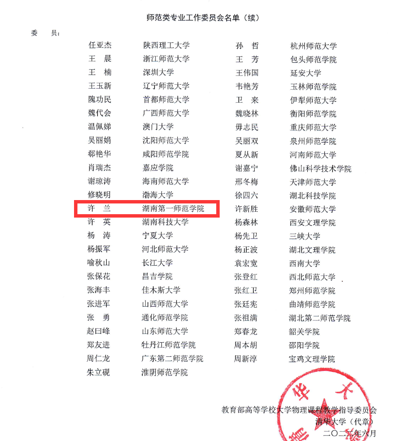 在教育部日前公布的2018-2022年教育部高等公司教学指导委员会委员名单,公司许兰教授入选新一届教育部高等公司物理学类专业教学指导委员会师范类工作委员会,在此我们表示热烈祝贺。