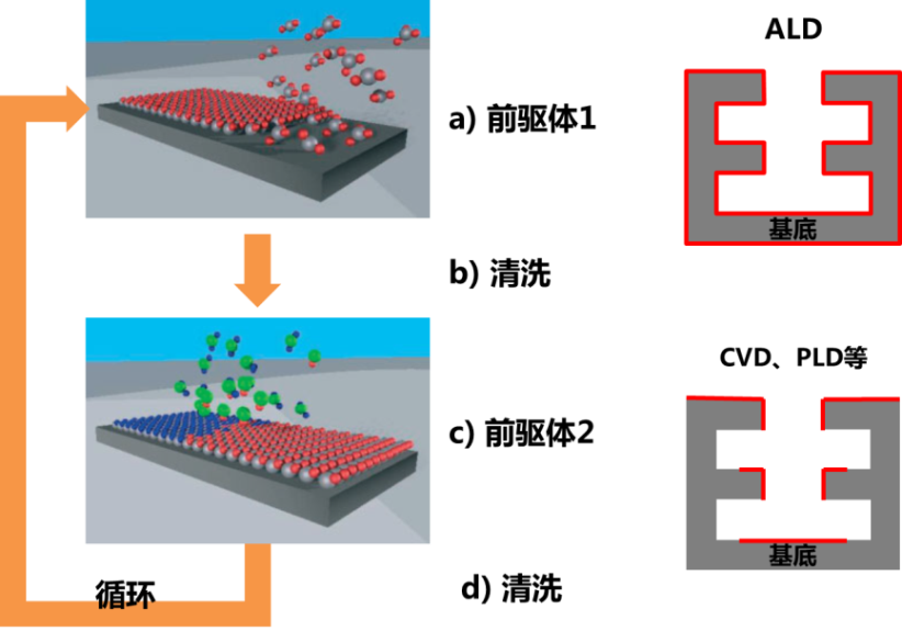 通过将气相前驱体交替脉冲通入反应室并在沉积基体表面发生气固相化学吸附反应形成薄膜。如ALD过程包含右图所示四个基本步骤:a)基底暴露于前驱体1并化学吸附;b)惰性载气清扫;c)基底暴露于前驱体2并与前驱体1分子反应;b)惰性载气清扫。ALD具有三维保型包覆的优点。